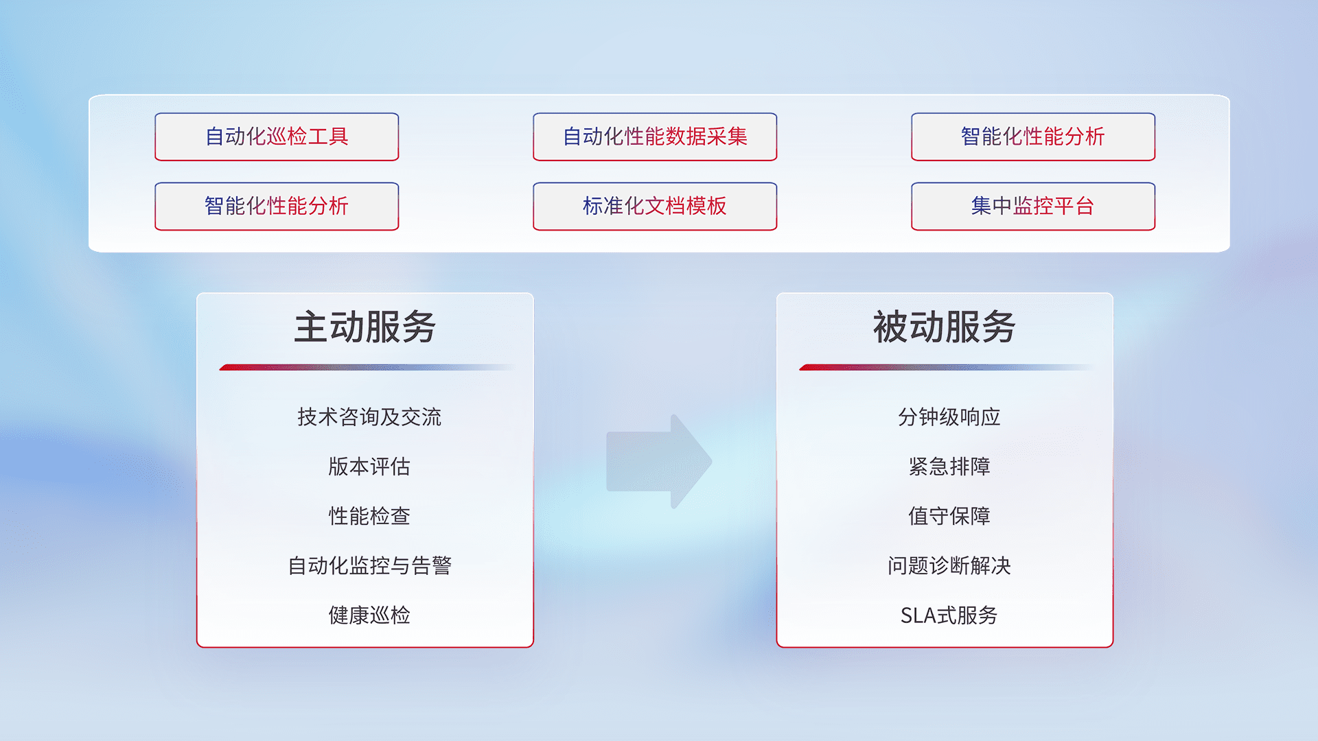 智能化工具和标准化文档,,,保障服务质量,,提供主动服务(包含技术咨询、、、版本评估、、、性能检查、、、、自动化监控与告警、、、、健康巡检)和被动服务包含(分钟级响应、、、紧急排障、、值守保障、、、、问题诊断解决、、SLA服务)。。。